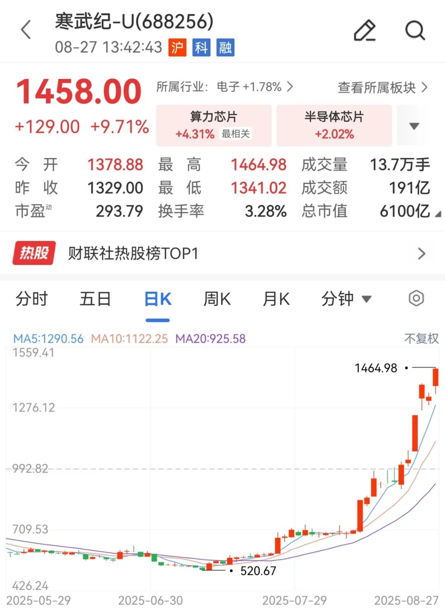今日(8月27日)盘中,寒武纪股价持续走强,拉升涨近10%,股价(1464元)一度超越贵州茅台成为新“股王”。
