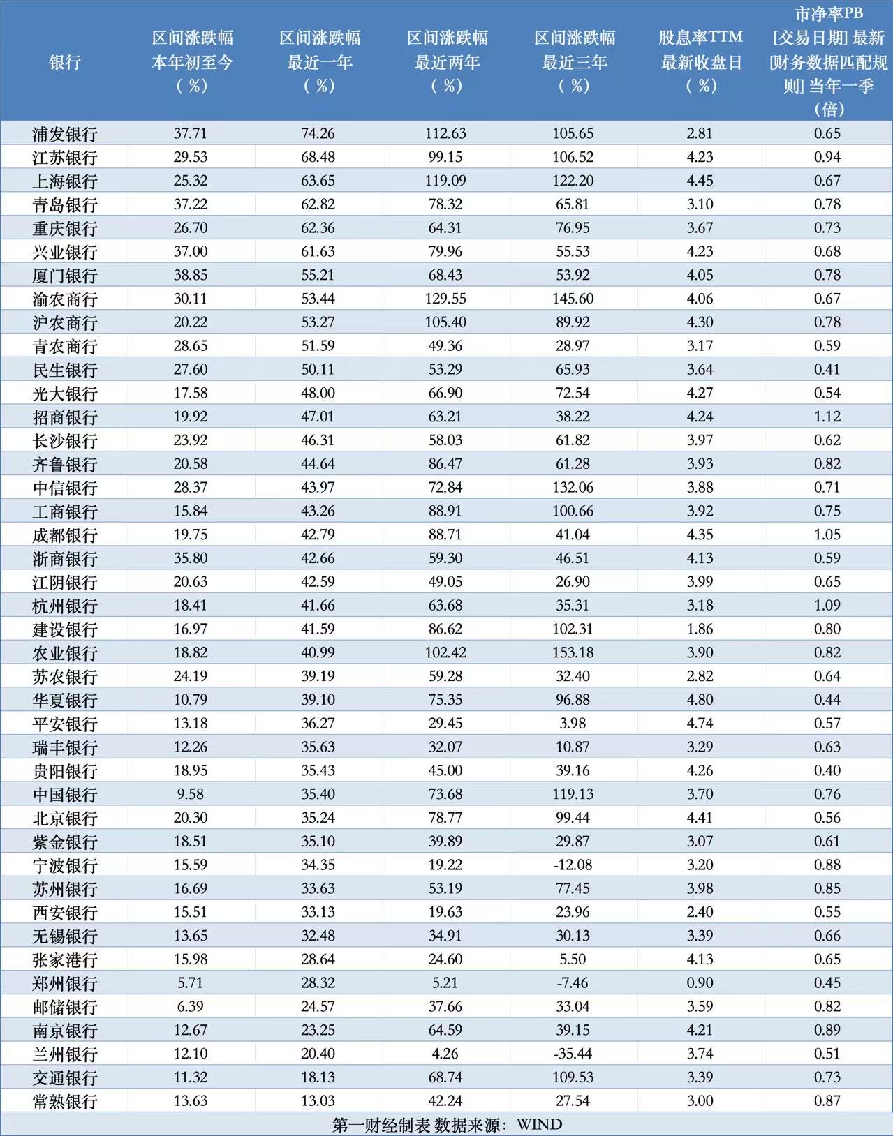 拉长时间来看,申万银行指数近一年涨幅为35.49%,位列行业第11位;近两年涨幅为52.11%,位列行业首位,且较涨幅位列第二、三位的非银金融(24.97%)、通信(20.86%)行业明显领跑。最近三年,申万银行指数涨幅在38%左右,位列涨幅近70%的通信行业。