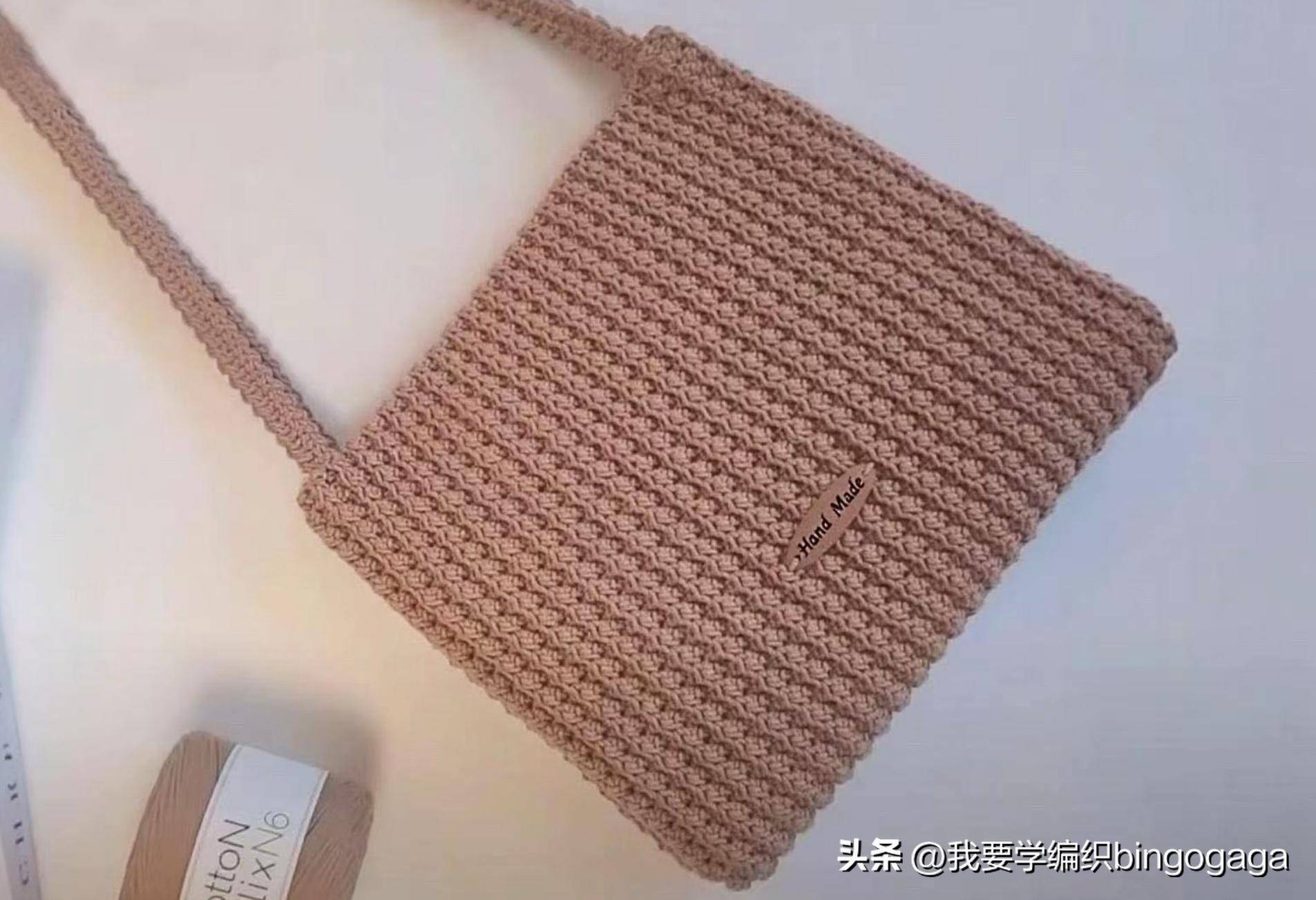 最后来钩包带驰赢策略,起3针锁针(开头打活结的那针松一点,也算作其中1针),第1行:倒入第2针依次钩1短(注:活结针挑最底下的半针钩短针,如图2);第2行:捏住右端向左翻转,跳过第1针,第2针上钩1短,再挑最左侧半针钩1短;第3行:捏住右端向左翻转,跳过第1针,第2针上钩1短,再挑左侧边的双线钩1短。后面就重复第3行的钩法一直钩到所需的长度;最后一行:其它一样,最后挑侧边双线钩引拔针。注:示范款钩了2根,每根大约81cm的长度。将包带与包包缝合(侧边+包面一起包着包带缝合),最后再缝上牌标,这款螺纹条肩包就完工啦~!