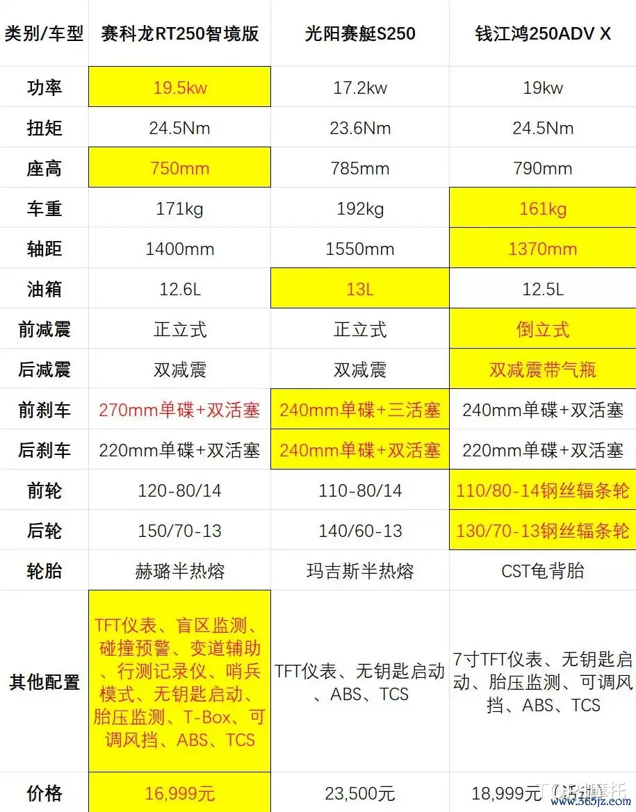 通过上图的大致参数对比,不难发现在一线品牌的250级别ADV跨界风格踏板当中,赛科龙RT250价格相当亲民,功能配置丰富,发动机性能突出,同时座高也是最矮的,这对于小编这种腿不是那么长的人来说,也是一种很大的吸引力。也因为性价比高的特征,赛科龙RT250在一众的250踏板当中竞争力表现突出。